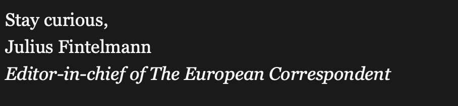 ➡️ Ce que j’en retiens : C’est qu’une vision jeune sur l’actualité d’un continent peut facilement trouver son lectorat et son modèle (même si la langue anglaise aide à viser un public large). Et le plus intéressant, c’est que ce collectif de trentenaires qui prennent la plume ne le fait pas forcément pour s’adresser à leur propre génération. Les deux tiers des abonnés à The European Correspondent ont plus de trente ans. Le seul crédo qui rassemble tout le monde, comme le rappelle la rédactrice en chef Julius Fintelmann en signature de ses mails (voir photo), c’est la curiosité.