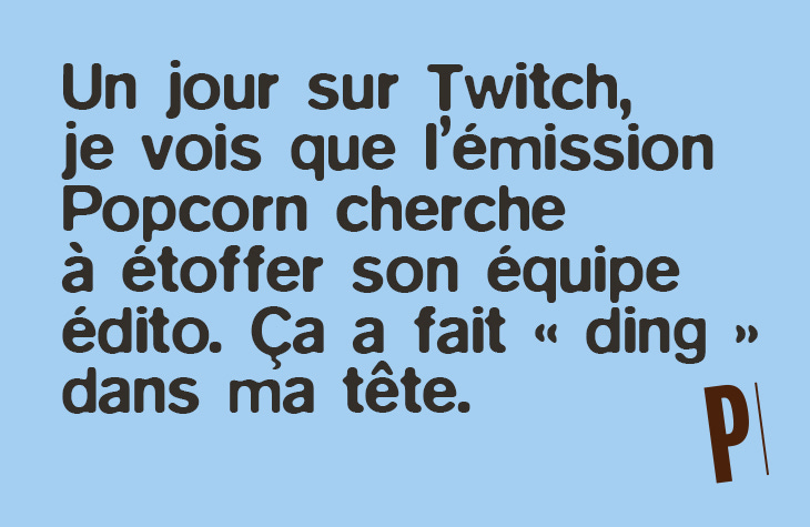 Il se trouve qu’au moment où je termine mon master en communication, j’ai un CDI qui m’attend en tant que responsable de communication numérique dans ma ville natale, à Arras. Et alors que je suis à deux-trois semaines de prendre mon poste, je vois que l’émission « Popcorn », que je regardais déjà sur Twitch, embauche. Le poste consistait à venir étoffer l’équipe éditoriale. Là, ça fait « ding » dans ma tête. J’ai fermé le stream et je me suis dit : « Est-ce que j’enverrais pas un CV juste au cas où, histoire de ne pas regretter ? ». J’en parle même à mes parents pour ne pas les faire trop flipper.