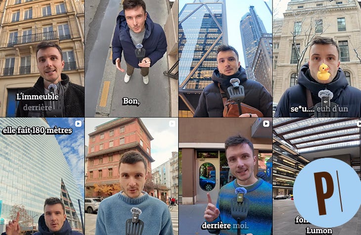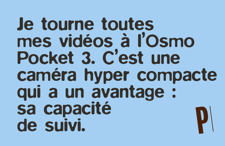 Pour ce qui est du matériel, je fais tout tout seul. J’ai mon téléphone avec mon script dans la poche et j’ai une Osmo Pocket 3 de chez DJI posée sur un trépied. C’est une caméra hyper compacte qui a un avantage : sa capacité de suivi automatique. Vu que je bouge pas mal devant les bâtiments dont je raconte l’histoire, c’est hyper pratique et ça rajoute une touche, je trouve, par rapport à l’iPhone.